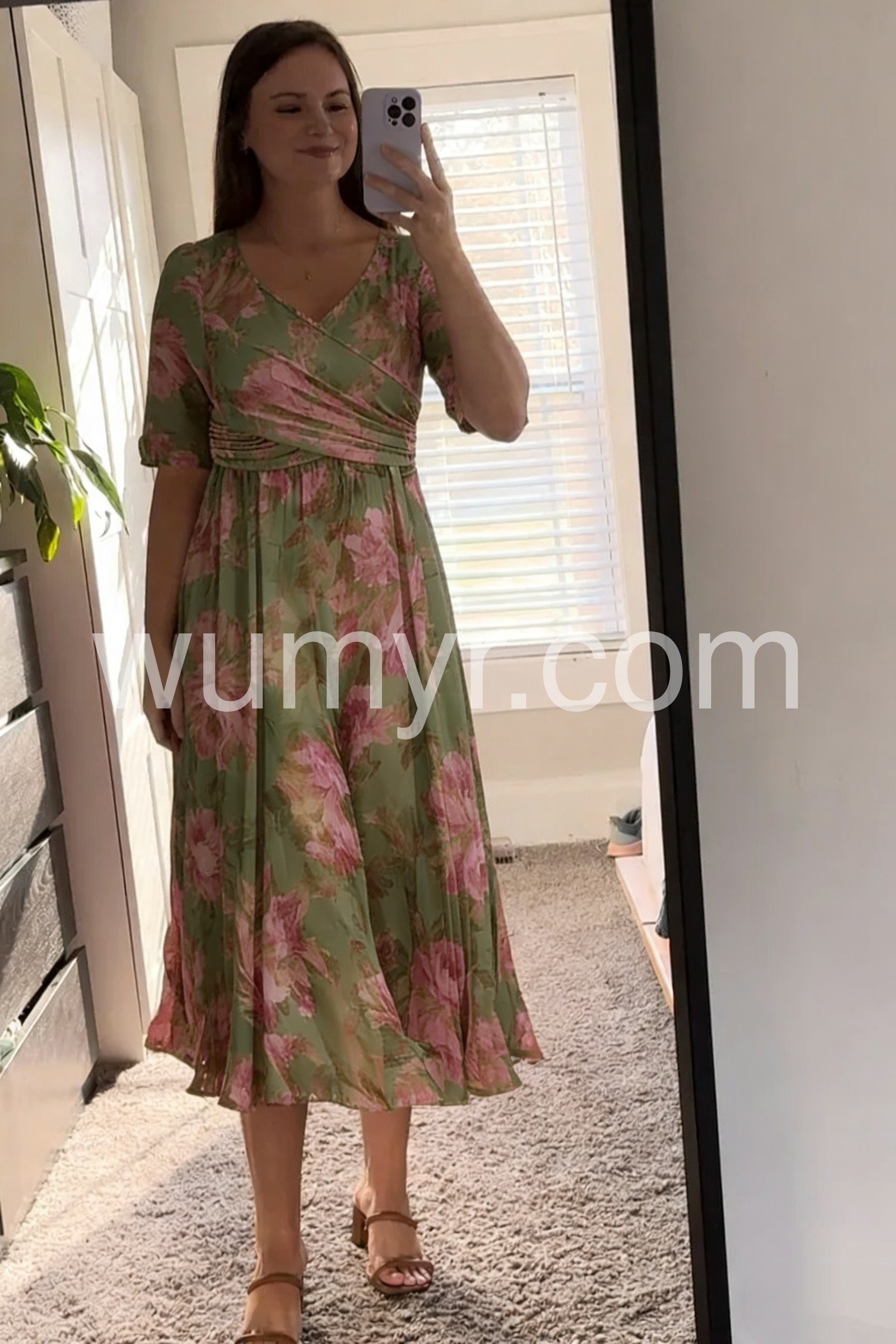 Yes! It runs true to the garment size chart please choose your size based on your measurements.This wrap-style midi dress features a lush green base with soft pink rose prints. The V-neck and short sleeves create a graceful silhouette. Side pockets add comfort and convenience. Lightweight fabric perfect for warm days. Ideal for garden parties or casual outings.